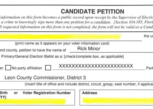 Mail the petition to: Rick Minor Campaign, P.O. Box 3113, Tallahassee, FL 32315